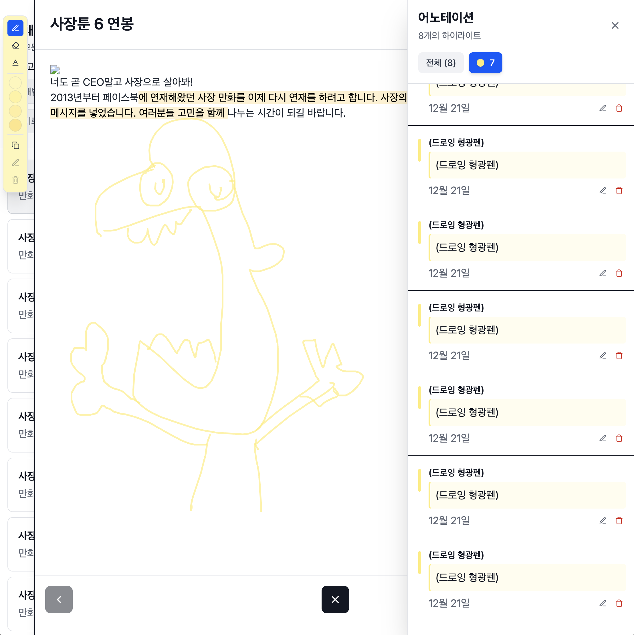 [image: 1766289255893-6f5b3ea5-7ac3-403e-af69-7406217cf292-image-resized.png] 카드뉴스 마무리하다 외부 공유용 api 를 붙이고 거기 새로운 정보를 제공하는 뉴스와 이런 저런 작업을 하다 만드는 김에 뷰어를 간단히 추가했습니다. 처음에는 간단하게 시작하다가 거기에 이상한 기능을 넣고 gnuboard->epub 편집기 (실제 그누보드는 사용하지 않고 DB구조만 쓰고 있습니다.) 교정본거 텍스트 추가한거 일한걸 다 볼 수 있습니다. 일한 것을 추적하고 그림 그린 것을 원고에 다시 넣어서 AI 가 바꿔서 그림책을 만들거나 여러가지 복잡한 작업을 할 수 있습니다. CRDT를 사용해서 누가 뭐하고 있는지 보이게는 했는데 혼자서 만들고 왼손이 오른손하고 협업합니다? 그누보드, 페이스북 백업, 네이버, 다음 등등 컨텐츠를 뽑아내서 합치는 기능외 나누는 기능도 준비중입니다. 2가지 작업에 주말 다 날렸네요 ^^ [image: 1766290872962-945bba74-5c5a-43ea-a728-17bacd15c42e-image-resized.png] 노란색 그림을 동화로 그려줘 라는 간단한 프롬프트로 만들어지는 동화책 [image: 1766291045658-157f6924-6cc5-4be7-9c39-f396afb36553-image.png]