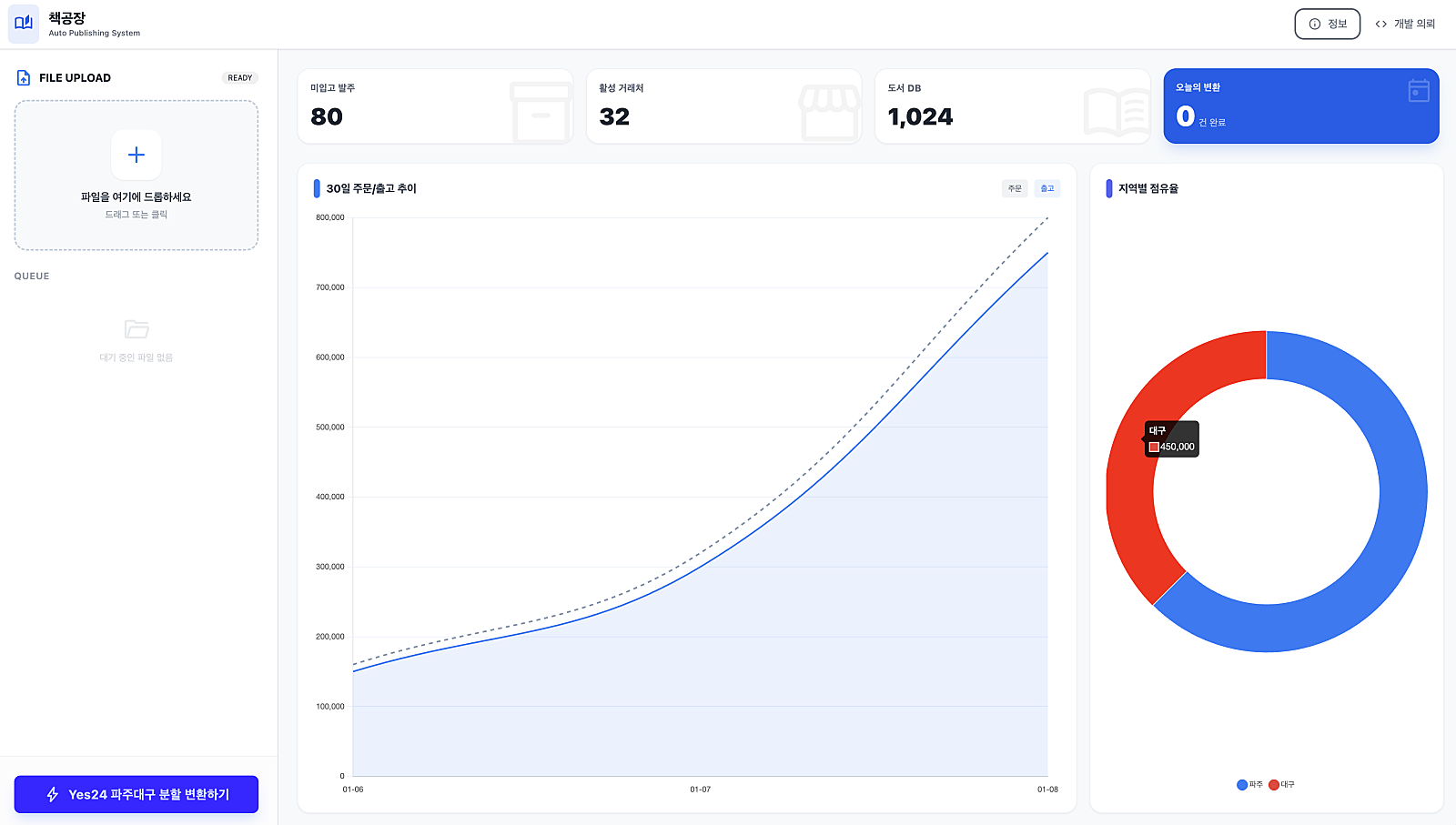 Yes24 파주/대구 주문서 분리 프로그램 yes24 파주, yes24 대구, 모아시스 통합주문 (파주/대구 일괄주문처리용) [image: 1767866166318-abb59cc7-c522-4a15-9ab4-889608970f65-image.png] Yes24 미입고 주문 엑셀 파일을 넣으면 파주/대구로 엑셀을 분할 하며, 모아시스 전용파일로 3개 파일이 다운로드 됩니다. 이 프로그램은 서버에서 동작하지 않고 서버에 어떠한 주문관련 데이터를 보유하지 않습니다. 모든 처리는 브라우저(WASM)에서 이루어집니다. 서버는 해당 브라우저를 동작하기 위한 주소만 제공합니다. 데이터 보안 (서버 전송 X): 사용자가 파일을 드래그해도, 이 파일은 서버로 업로드되지 않습니다. 모든 변환 과정이 사용자 브라우저의 메모리(WASM) 안에서만 이루어집니다. 보안이 중요한 주문 개인정보가 네트워크를 타지 않으므로 매우 안전합니다. 서버 리소스 제로 (CPU 독립): 파일을 1,000개가 넘게 처리하더라도 서버의 CPU는 전혀 사용하지 않습니다. 사용자의 PC 성능을 활용하여 매우 빠르게 동작합니다. 기능적 독립성: 서버에 통계(DB)나 방명록 기능이 죽더라도, 핵심 기능인 '엑셀 변환'은 아무 문제 없이 계속 작동합니다. 인터넷이 끊긴 상태에서도(프로그램이 로드된 이후라면) 변환이 가능합니다. 네이버 꿈꾸는 책공장에서 출판에 관련된 20년간 해결하지 못한 문제를 웹 어플리케이션으로 제공합니다. https://bookfactory.kr https://cafe.naver.com/bookfactory/181803 네이버 꿈꾸는 책공장 운영자