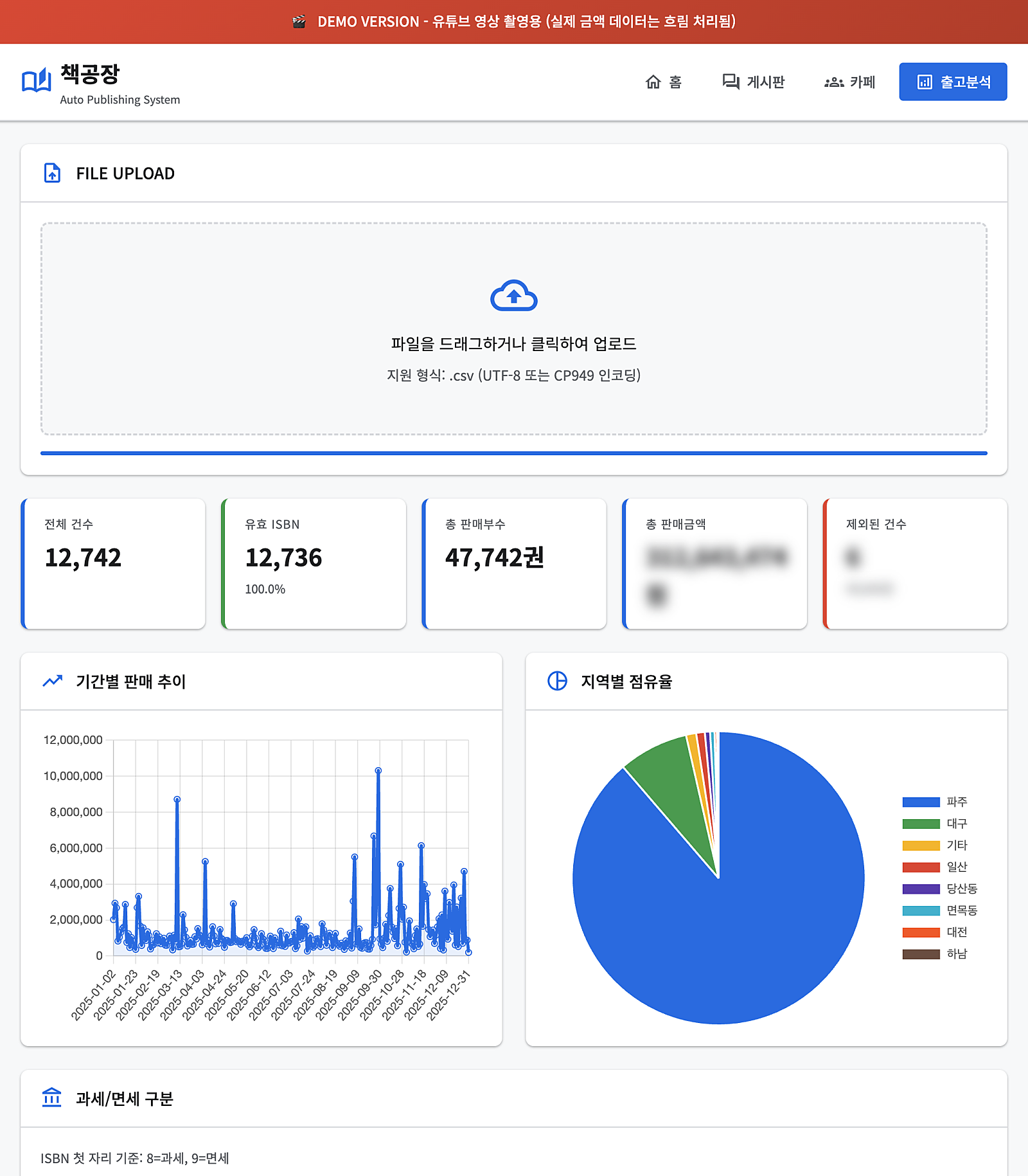 출판사 SCM으로 모아시스라는 프로그램을 사용합니다. 그런데 여기는 리포트가 제대로 나오지 않습니다. 거래 파일을 드래그해서 드롭하는 순간 판매데이터 기반의 정보를 가지고 리포트를 생성하고 정보를 가시화해서 줍니다. 영업자료를 보실 수 있게 자료를 제공하지만 그 데이터로는 뭐가 어떻게 되는지 잘 모르실 수 있습니다. 그래서 도서 판매되는 정보를 한 눈에 볼 수 있게 인포그래픽으로 보실 수 있게 사이트에 기능을 추가하고 있습니다. 이 어플리케이션은 웹에만 있지 실제 브라우저에서 랜더링하고 본인 컴퓨터외에는 어떠한 데이터도 서버에 전송하거나 하지 않습니다. 그냥 앱을 웹에 올려놓았습니다. 일단 기간별 자료를 csv 로 다운로드 받고 파일을 드래그 하면 즉시 리포트가 생성됩니다. ​https://www.youtube.com/watch?v=_fEJtCHqV1U [image: 1767954181532-4fbb6295-9cb0-45e5-a9f0-038228a968c0-image.png] 일단 모아시스 사용하시는 분만 테스트하실 수 있습니다. 더 많은 인포그래픽을 카테고리별로 도서 정보, 판매지수, 이벤트 진행중인 부분 서평, 유튜브 검색된 도서 서비스를 추가 할 생각입니다. 그리고 온라인 서점데이터와 매칭해서 더 많은 정보를 그리고 더 정확한 지역 판매 정보를 하나로 통합해냅니다. 그리고 브라우저(wasm)에서 데이터 분석을 하고 정보는 서버에 보내지 않습니다. 그냥 데모로 보여주기위해 온라인에 올려놓은 것 뿐이예요. ERP라서 슬슬 데이터 마케팅 회사로 툴들을 준비하고 있습니다. 클래스108에서 연락오기는 했는데 책파는 것보다 강의를 해볼까 요즘 고민이 많습니다. https://bookfactory.kr/