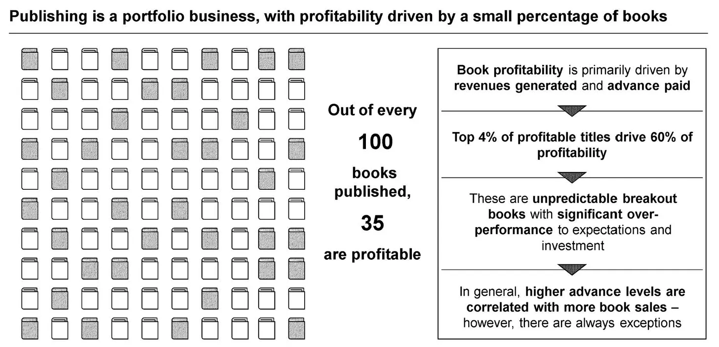 Penguin Random House의 CEO인 Markus Dohle는 상위 4%의 타이틀이 수익성의 60%를 좌우한다고 말합니다. 나머지 사람들에게도 마찬가지입니다.그 정도의 이익을 창출하는 것은 백 권 중 단 두 권의 책일 것입니다. 두 권의 책이 수익성의 가장 큰 몫을 차지합니다.