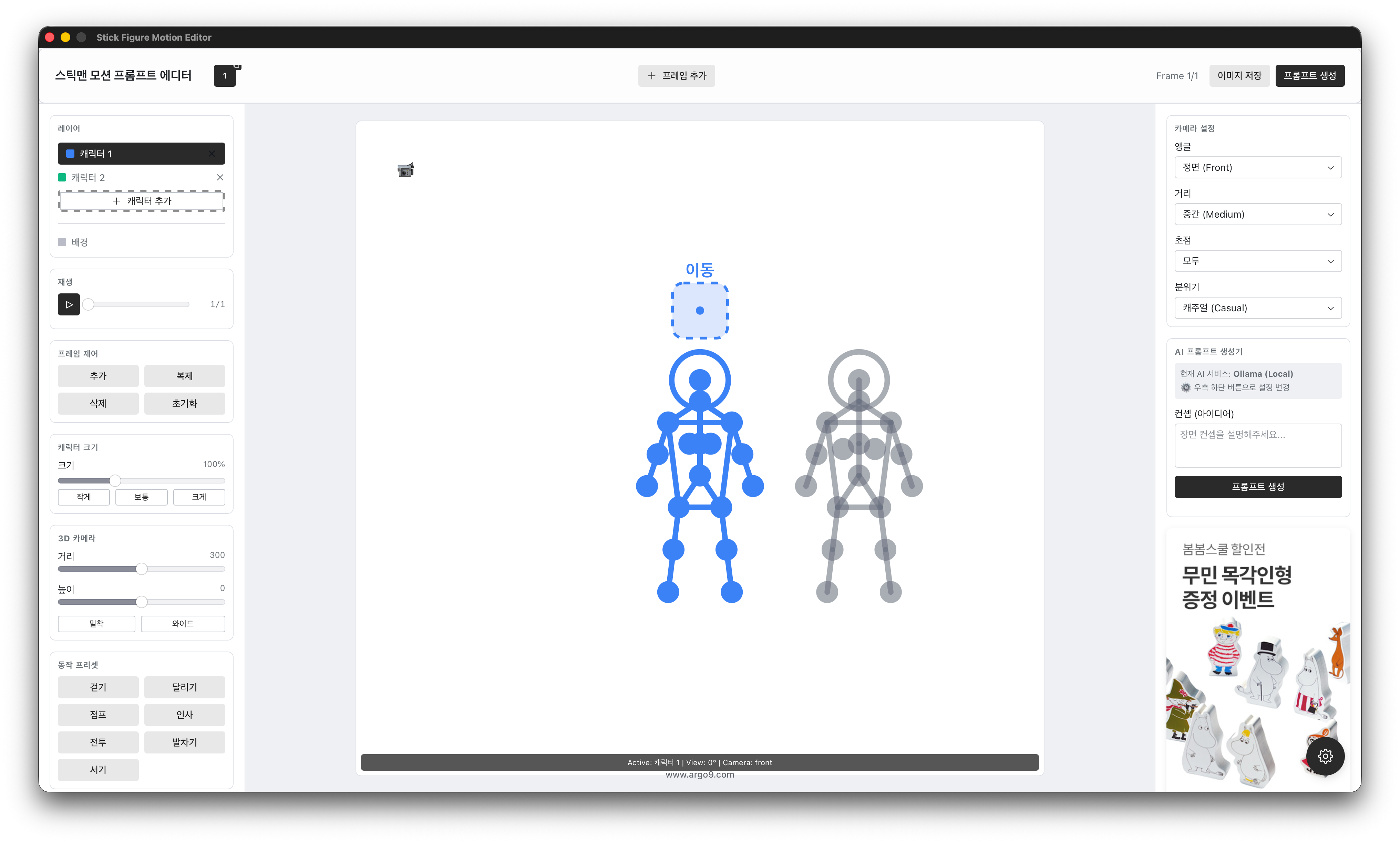 이 도구는 Ollama의 Gemini API 또는 다른 LLM을 활용하여 무료로 다양한 캐릭터의 프롬프트를 생성하고, 이를 통해 프레임 애니메이션 및 스틱맨 액션을 만들 수 있게 돕는 프로그램입니다.나노바나나, 미드저니 프롬프트를 한글로 쓰면 영어로 번역하며 기본적으로 랜즈 설정과 카메라의 각도, 연출을 스틱맨을 캐릭터로 추가 변경하며 장면단위로 스테이지에 배치된 복수의 스틱맨의 포즈를 프롬프트와 이미지로 출력해서 다시 생성형 AI에 고유 효과를 넣어줄 수 있습니다.