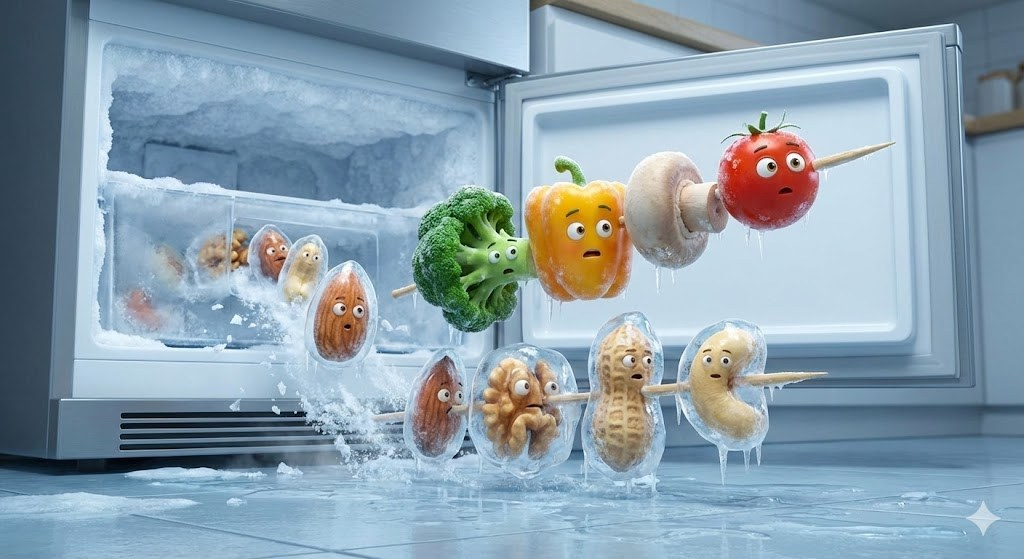 야채 친구들과 견과류 형제들은 손(잎)과 손(껍질)을 잡고 탈출 작전을 세웠어요.